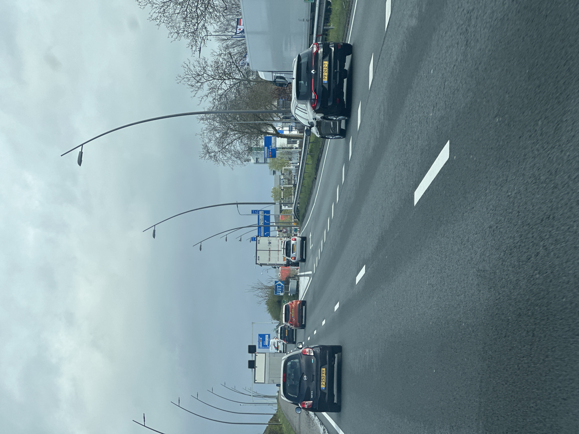 A wide-angle photograph depicts a multi-lane highway section of the A2 or N2 near Eindhoven, Netherlands, specifically approaching exits for Strijp, Meerhoven, and Eindhoven Airport. The overhead sky is uniformly overcast with light gray clouds, providing diffuse daylight. The asphalt road surface appears generally dry and dark, marked by dashed white lane lines separating at least three visible lanes and solid white lines defining the shoulders and an upcoming exit. White chevron markings are visible on the right shoulder, guiding traffic towards the exit. Slender, curved streetlights with single arms extend over the highway from both sides, spaced along the route. On the right, a metal guardrail separates the roadway from a grassy embankment populated with bare deciduous trees, indicative of early spring or late autumn. Multiple blue highway signs are visible. An overhead gantry sign is in the distance. Closer on the right, a large sign indicates "Eindhoven" and "Strijp" along with route numbers "7500 - 9200". Immediately adjacent is a smaller blue sign displaying "UIT" (Exit) with directional arrows, confirming an approaching exit to destinations including "Vliegveld" (Airport), "Oud Strijp", and "Meerhoven". A white-sided commercial truck with "VAN LEEUWEN" branding is partially visible in the far right lane. Vehicles are in motion, traveling in the same direction, indicating moderate traffic flow. In the foreground, a dark gray Nissan Micra (K13 generation) with Dutch license plate J-253-XV occupies the leftmost visible lane. To its right and slightly ahead is a black Renault Mégane estate (PX-262-T), equipped with a visible tow hitch, traveling in the adjacent right lane. Further back in the left lane is an orange/red compact SUV with a partially visible Dutch license plate (G-888). In the rightmost lane, a white small SUV (partial plate PZ-00-XX) follows behind the Van Leeuwen truck. No individuals are explicitly visible outside of the vehicle interiors.