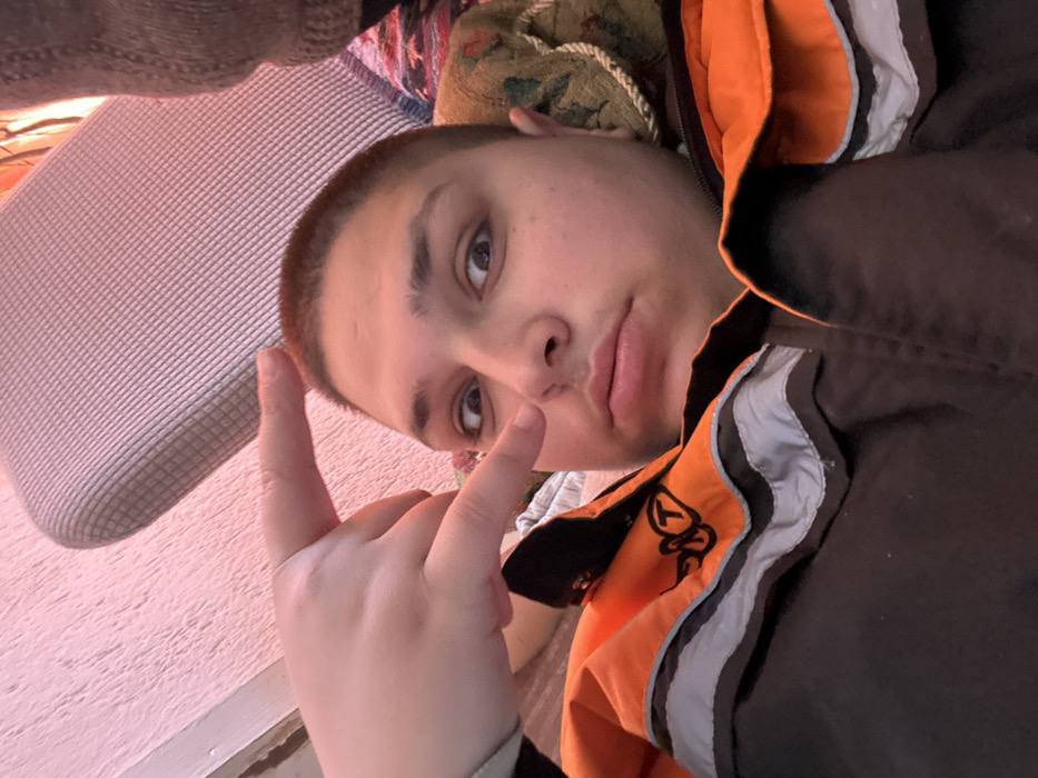 A young individual with a buzz cut lies supine, looking directly into the camera with wide eyes, exhibiting a slight inward gaze. The left hand is raised, performing a gesture with the index and pinky fingers extended, while the thumb secures the middle and ring fingers. The person is wearing a black jacket with an orange upper section featuring two horizontal grey reflective stripes and a dark emblem on the right chest area. A textured, light-colored cushion with a striped pattern is visible in the upper background, alongside a pink-hued, textured wall. Portions of a dark green/brown patterned pillow and a brown knitted item are also present in the background. The scene is indoors, located in Zagore, Bulgaria.
