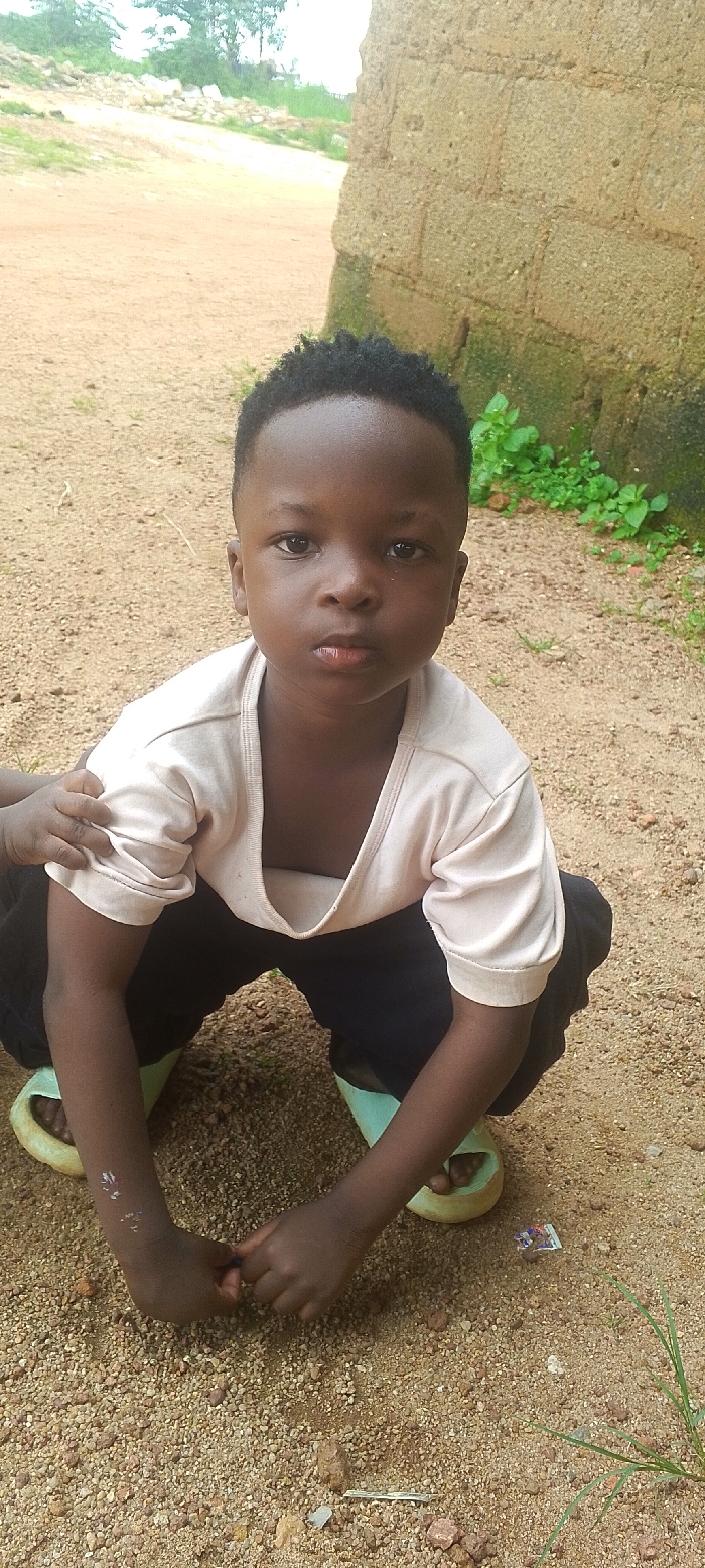- "A young child, approximately 3-6 years old, with dark skin and short, kinky black hair, crouches directly facing the camera on a light brown, gravelly dirt surface in the city of Unknown, Unknown" by FM-ICGSG3, licensed under CC BY 4.0