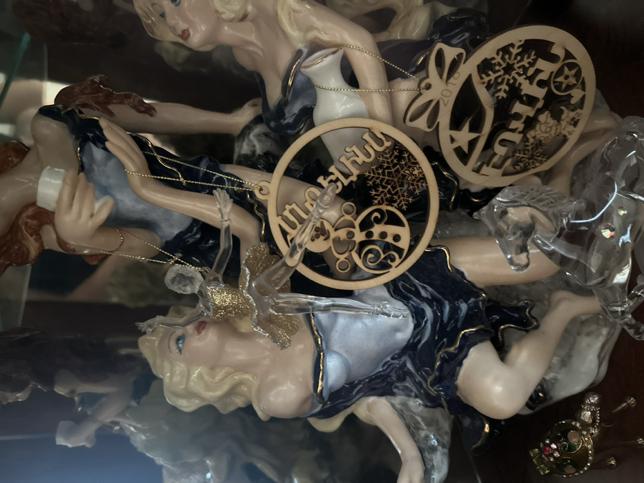 The image displays a close-up, indoor scene featuring an arrangement of decorative items, located in the city of Yerevan, Armenia. The central subjects are multiple ceramic or porcelain figurines of women, posed amidst a reflective, dark background, likely a display cabinet. A prominent blonde-haired female figurine, wearing a blue and white draped garment with gold trim, is positioned on the left, looking upwards. Above her, a second figurine with reddish-brown hair is visible, holding a small white cup and similarly adorned. A small, transparent glass ballerina figurine with a gold glitter tutu is suspended in front of the blonde figure. Two laser-cut wooden ornaments hang from gold strings. The upper ornament is circular, featuring the Armenian word "ՄԱՅՐԻԿ" (Mother), a snowman design, and a snowflake cutout. The lower ornament is oval-shaped, displaying the Armenian word "ՓԱՓՈՒԿ" (Soft), a snowflake, and the year "2018," with a decorative bow shape at its top. Further objects include a clear glass horse figurine in the lower right, and a small, ornate green and gold object adorned with red and clear jewels, resembling a decorative trinket box or stylized animal, situated in the lower left foreground. The environment suggests an indoor display setting with artificial lighting, and reflections indicate the presence of glass or a mirrored surface.