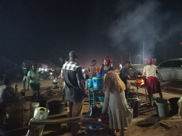 A bustling nighttime street scene with numerous people gathered. A food vendor is preparing food over an open fire, smoke rising into the air. Another vendor stands behind a table with blue containers. Other individuals mill about, some standing near a parked car. The scene is dimly lit, suggesting the presence of artificial lighting amidst the dark.