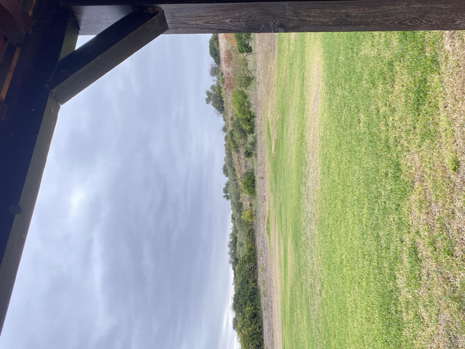 The image displays an outdoor rural landscape view in Cartaxo, Portugal, framed by a dark wooden architectural structure. A horizontal wooden beam crosses the top of the frame, and a vertical wooden post with an angled support beam is present on the right, suggesting a covered overlook. The midground features an expansive, undulating field of green and yellowish-brown grass. The background reveals a gently sloping hillside densely covered with varied trees and shrubs; green foliage dominates the left portion, transitioning to trees exhibiting autumnal colors (yellow, orange, light brown) on the right. The sky is uniformly overcast with light grey clouds. No individuals, animals, or specific man-made objects, aside from the framing structure, are visible in the scene.