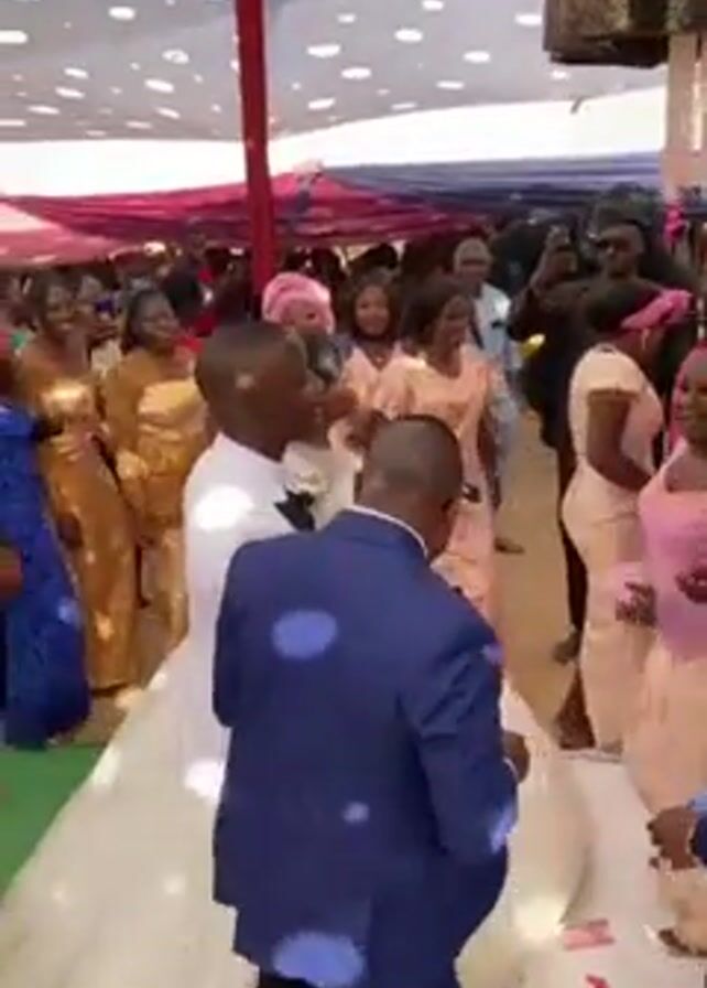 A wedding celebration under a tent is captured in this medium shot. A bride in a large white gown and a groom in a white tuxedo are dancing amidst a crowd of guests, some in pink dresses and others in blue suits. The camera rotates around the dancing couple. The setting is lively, with people cheering and moving around. The tent above is decorated with colorful fabrics and lights.