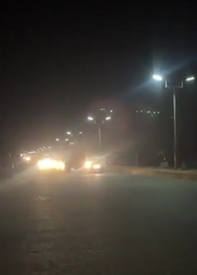 The video depicts a dark, slightly foggy, street scene at night. Streetlights illuminate the road. Several vehicles with bright headlights are seen driving on the road. One larger vehicle, possibly a truck or van, passes close to the camera. The overall scene gives the impression of a typical urban or suburban road at night.