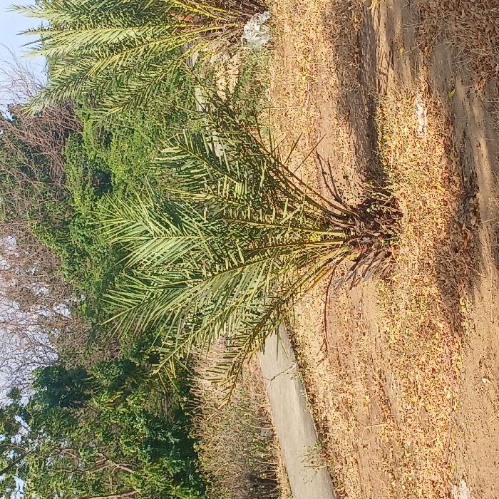 The scene depicts an outdoor environment, identified as being in the city of Altagracia, Venezuela. The central subject is a small, young date palm (Phoenix dactylifera) approximately 1 to 1.5 meters tall, featuring numerous green fronds radiating from a dark brown, textured trunk base. The palm is situated on dry, light brown earth heavily scattered with desiccated, light brown and orange fallen leaves. To the left, a narrow, light gray concrete pathway curves from the lower left corner towards the mid-left background. In the mid-right, a portion of a larger, mature palm tree is visible, with a crumpled piece of white plastic or fabric resting near its base on the leaf-strewn ground. The background consists of dense, varied green foliage, including bushes and taller trees, some with sparse branches, indicating an uncultivated or minimally maintained area. Shadows are visible on the ground, suggesting direct sunlight from an unseen source above and to the right. No individuals, animals, or active events are present within the frame.