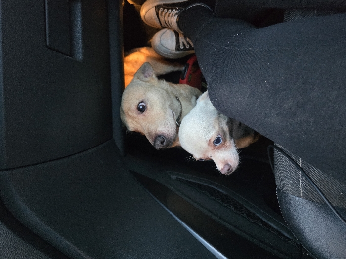 The scene is set inside a vehicle, likely in the city of Lys-lez-Lannoy, France. Two dogs are visible in the foreground and midground. A light brown, short-haired dog with dark eyes is centrally positioned, looking upwards and to the left. It wears a dark collar and a red harness. Situated in front of it and to the left is a smaller, cream-colored dog with distinctive blue eyes and a pink snout, looking towards the left. Both canines appear to be situated on the floor or a low surface within the vehicle. To the right, a human leg clad in dark leggings is present, bent at the knee. A human foot wearing a light-colored sneaker with dark laces is partially visible behind the larger dog. The immediate environment consists of dark vehicle interior components, including a textured panel on the left with a mesh pocket, and an overhead dashboard section. The lighting is subdued.