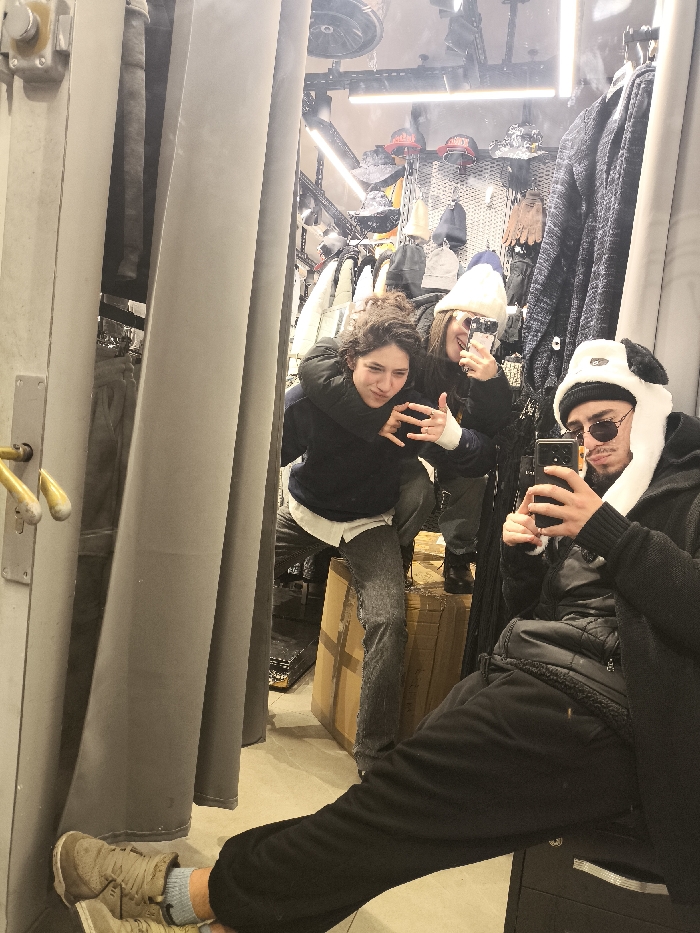This image depicts three individuals in a retail environment, likely a clothing store or fitting room, in Strasbourg, France. The scene is captured via a mirror reflection. In the foreground to the right, a male individual with a faint mustache and short dark hair is taking a mirror selfie using a black smartphone held in his right hand. He wears sunglasses, a black hoodie, a black puffer vest, and black sweatpants. A distinctive white beanie with black panda-like ears covers his head. His left leg is extended forward, revealing a light blue sock and a light brown sneaker. Behind him, to the left, a female individual with curly brown hair is visible from the waist up. She is crouching or standing on a large, light brown cardboard box, wearing a dark blue long-sleeved top over a white collared shirt and dark jeans. Her hands are clasped together in front of her chest, forming a gesture resembling "rock on." Behind and embracing this female individual is another female, smiling. She wears a white beanie with a blue stripe and a dark top. She appears to be standing on a second cardboard box, her dark boots visible. She holds a small, black rectangular device, possibly a camera or another smartphone, up with her right hand, seemingly capturing a moment. The background shows racks of clothing, including various hats (beanies, bucket hats) and what appear to be jackets or other garments, indicating a commercial retail space. A bright fluorescent light fixture is visible on the ceiling. To the far left, a section of a light gray wall or door frame with brass-colored door handles is visible, along with vertical gray curtains.