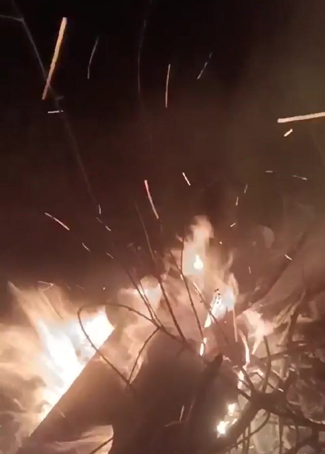 A video filmed at night shows a bonfire burning. Flames are visible, along with sparks. Thin tree branches are situated around the base of the fire. Music plays in the background.