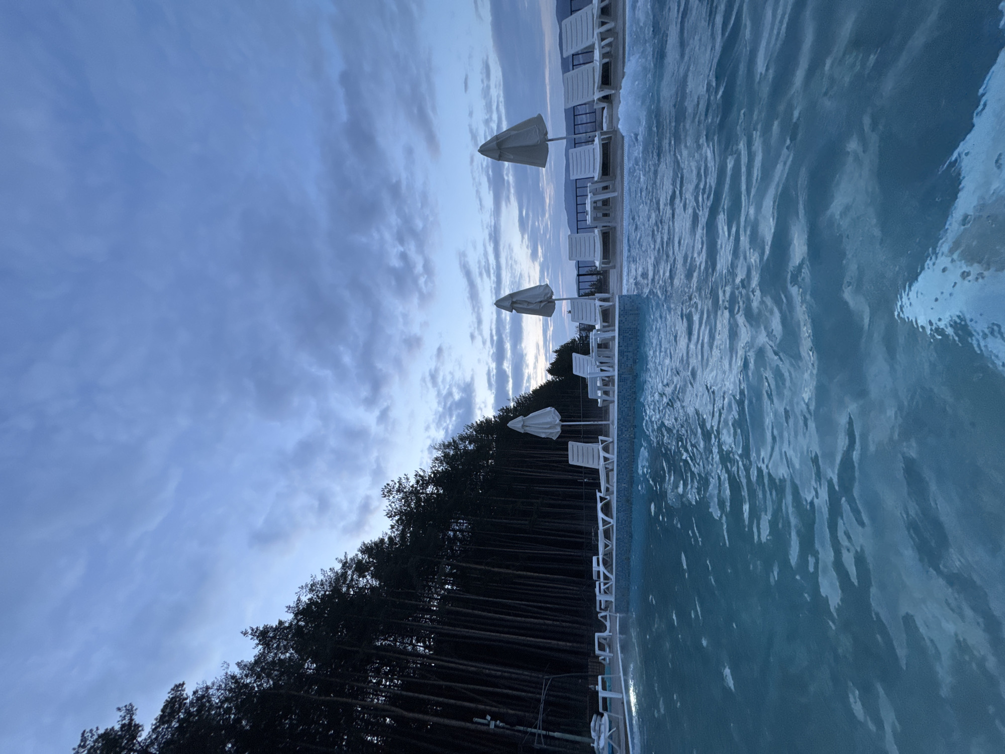 An outdoor thermal pool in Sapareva Banya, Bulgaria, is captured at twilight under a cloudy, blue-gray sky. The lower half of the frame shows the light blue, agitated water of the unoccupied pool, with an integrated, tiled edge composed of blue and white mosaic on the left. Water jets or currents cause noticeable ripples and frothing on the surface, particularly on the right side. The elevated pool deck, positioned in the midground, is furnished with multiple white plastic lounge chairs and small white tables, arranged in rows facing outward. Three large, conical, folded white sun umbrellas are interspersed among the seating arrangements. A black metal railing separates the pool area from a panoramic view of distant, undulating mountains or hills under the dim sky. To the left, a dense, tall pine forest rises steeply, its dark trees forming a prominent silhouette against the horizon. No individuals are present within the scene. A subtle artificial light source is visible beneath the water surface on the far left edge of the pool.