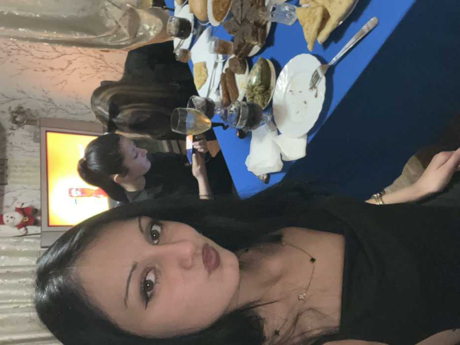 The image depicts three females gathered around a dining table in an indoor setting in Lanchkhuti, Georgia. In the foreground, a female with long dark hair, dark eyes, and pronounced eyeliner is taking a selfie, her lips pursed. She wears a black V-neck top and a necklace with dark clover-shaped charms. A gold-toned watch is visible on her left wrist. Behind her, to the left, a second female with dark hair tied in a high ponytail is engrossed in a smartphone or similar electronic device, holding it with both hands and looking down. She wears a dark long-sleeved top. To her right, a third female, partially obscured, has long, light brown hair falling forward, obscuring her face, and is also wearing a dark top. The table is covered with a bright blue tablecloth and laden with various food items and beverages. Visible items include multiple plates of dark pastries or cakes, a plate of green pureed food, a plate of sausages, flatbread, and an empty white plate with food remnants and a fork. Numerous glasses are present, including wine glasses (some containing red liquid, others lighter liquid) and smaller shot glasses. White napkins and a lighter are also on the table. In the background, an older model television displays an animated image with bright orange and yellow hues. A small Santa Claus figurine sits atop the television. The wall features light-colored wallpaper with a subtle pattern. A light-colored curtain is visible on the far right. The overall scene suggests a casual meal or gathering.