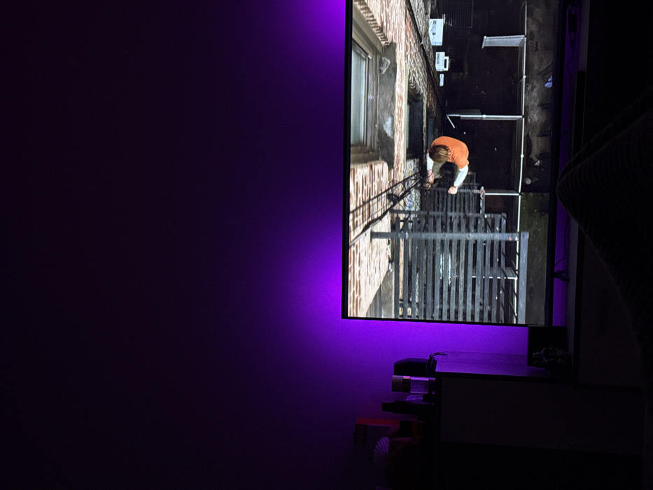 television with a purple light strip behind it. On the screen, a person in an orange shirt is descending a fire escape outside a brick building. The view is from above, looking down at the person on the ladder. The TV is sitting on a dark entertainment center, and the rest of the room is dimly lit.