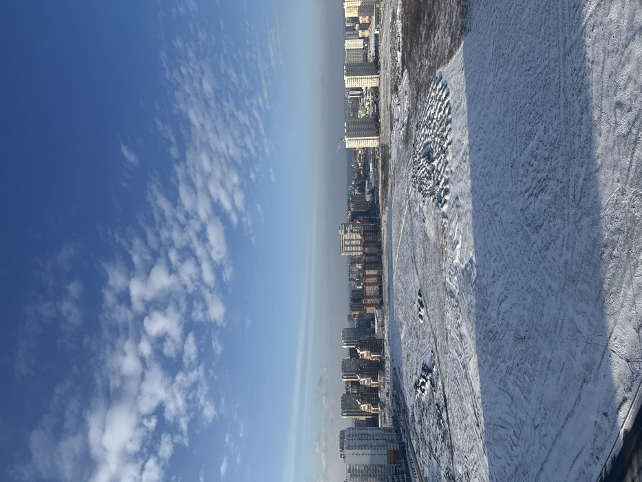 This image depicts a high-angle, panoramic view of a snow-covered urban landscape in Anapa, Russia, under a clear blue sky sparsely populated with white, scattered clouds. The foreground and midground are dominated by an expansive, flat area covered in a thin layer of snow, exhibiting numerous tire tracks and foot imprints. Towards the left of this field, several dark, irregular mounds partially covered by snow are visible. A significant feature on the right side of the snow-covered area is a large, roughly circular pattern composed of numerous small, conical mounds of snow arranged in concentric rings. The background reveals a dense urban environment characterized by a multitude of multi-story residential and commercial buildings of various heights and designs, extending towards a hazy horizon line where a body of water, presumed to be the Black Sea, is faintly discernible. Sunlight illuminates the scene from the right, casting a soft shadow across the bottom right portion of the foreground. No human figures or active vehicles are present in the observable areas.