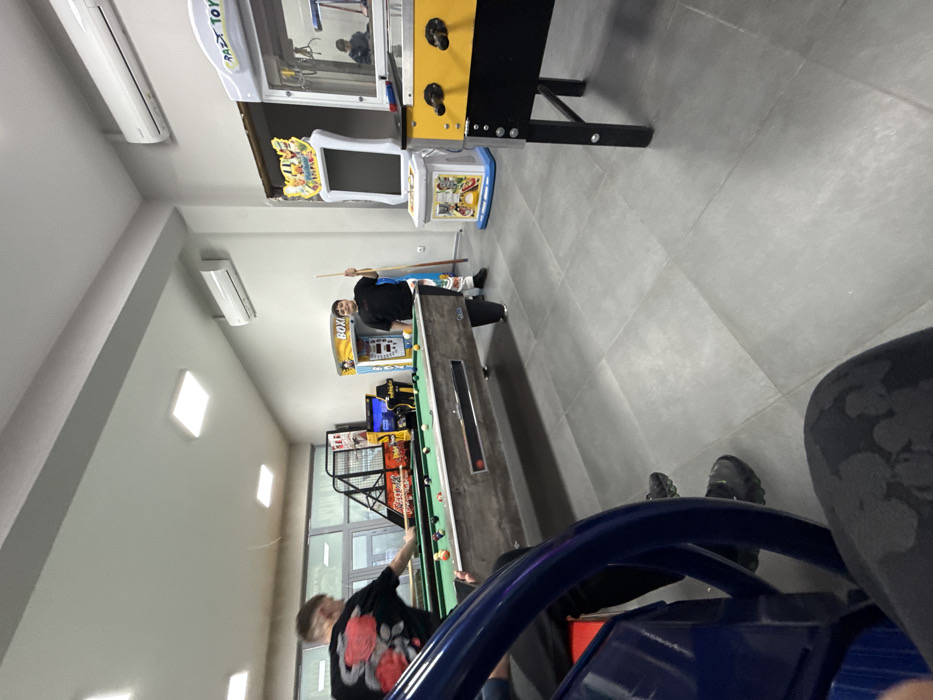 An indoor recreational space in Dimitrovgrad, Bulgaria, features a grey tiled floor, light grey walls, and a white ceiling with square recessed LED lights and two wall-mounted air conditioning units