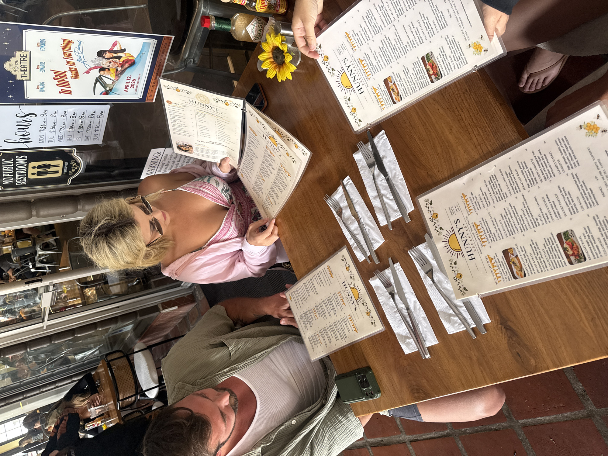 A top-down shot depicts a table setting at Hunny’s restaurant. The table features four copies of the Hunny’s menu, each accompanied by silverware wrapped in white napkins. Two individuals are perusing the menus. A woman, wearing sunglasses and a pink top, sits on one side of the table, while a man in a green shirt sits opposite her. A third person is holding a menu from above, and a fourth person has their feet on the brick floor. In the background, a poster advertising a show at the Plaza Theatre titled "To RuPaul, Thanks for Everything!" with a date of April 12, 2026, is visible alongside the restaurant’s hours of operation. A small vase containing a sunflower is placed next to bottles of hot sauce. A cell phone rests on the table near the man. The scene is set in Palm Springs, United States of America.