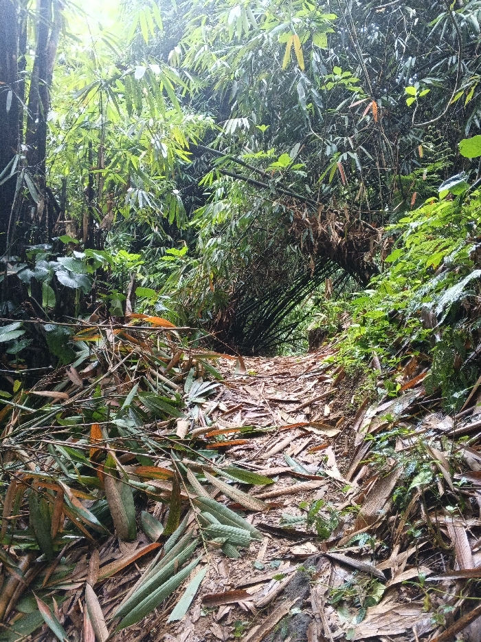 A narrow, unpaved dirt path, approximately 1 to 1.5 meters wide, extends into a dense bamboo forest in Baglung, Nepal. The path's surface and immediate surroundings are heavily covered with a layer of fallen bamboo leaves, exhibiting various stages of decomposition, ranging from vibrant green to ochre and dark brown. The ground appears damp in several areas. Tall bamboo culms and dense green foliage form a thick canopy overhead and along both sides of the path, creating a tunnel-like effect as it recedes into the background. Smaller, broad-leafed plants and undergrowth are visible at the lower left and right edges of the frame. No individuals or man-made structures are present within the scene. Overcast or filtered light illuminates the area from above.