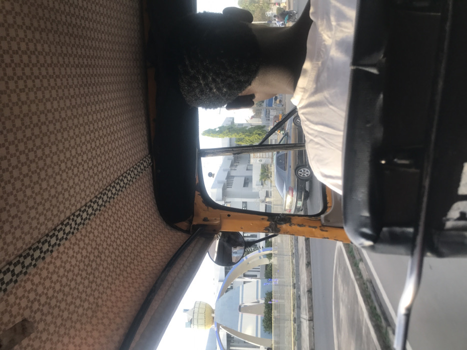 Inside a yellow auto-rickshaw, a passenger is visible from the side. The interior features a tan and brown patterned ceiling. Through the open window, a street scene unfolds, revealing a car and white buildings. The vehicle's frame and rearview mirror are also captured, adding to the perspective of a ride in progress.