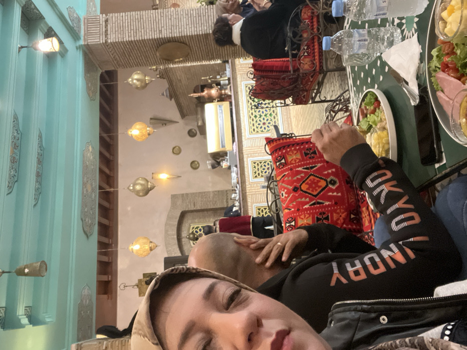 An indoor scene depicts patrons dining in a restaurant located in Al Machouar – Stinia, Morocco. In the immediate foreground, a woman's partial face and upper torso are visible on the left, indicating a selfie perspective. She wears a beige head covering and a black jacket. To her right, the bald head and back of a man are visible. He wears a black sweatshirt with "TOKYO" and partially obscured text on the sleeve, and his right hand is raised near his head. The two individuals are seated at a dark green table covered with a patterned white and green tablecloth. On the table are two clear plastic water bottles, a black smartphone, cutlery, and plates of food. One plate contains a salad with lettuce, tomatoes, and what appears to be sliced deli meat, accompanied by a small bowl of fruit salad. Another plate holds a salad with lettuce, tomatoes, and a side dish containing a yellow, granular substance, possibly corn or pasta salad. The background reveals a traditionally decorated restaurant interior. The ceiling is light turquoise with intricate floral and geometric patterns in darker blues and greens. Multiple brass-colored pendant lanterns, some with ornate designs, hang from the ceiling. The walls are a warm beige, featuring decorative brick-like pillars and archways. In the mid-ground, a bar area is visible with a tiled counter featuring geometric patterns in green, yellow, and white. Behind the counter, a man in a red vest stands, and various bar equipment is present, including a gold-toned espresso machine and an ornate brass samovar. Decorative plates or wall hangings adorn the wall behind the bar. To the right of the foreground table, several other individuals are seated at tables, partially visible from the back, including a woman with dark hair wearing a black garment with a white collar. The chairs in the restaurant are made of wrought iron and feature red cushions with intricate, multi-colored geometric Moroccan patterns.