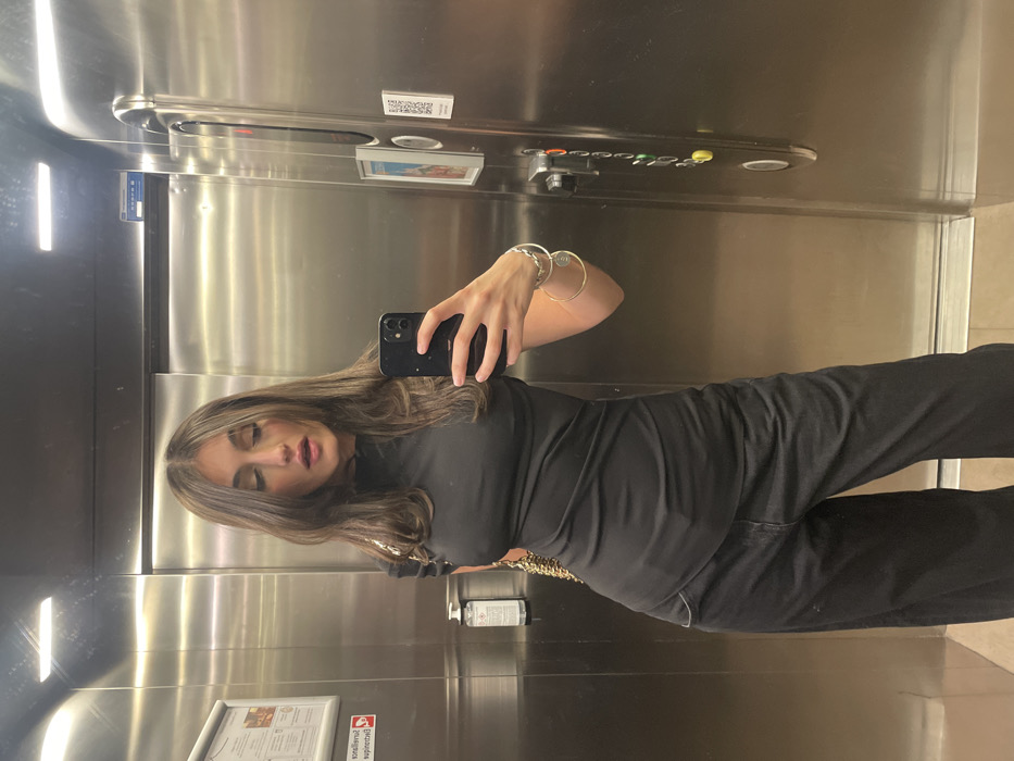 The scene depicts a female individual taking a mirror selfie inside an elevator in a building in Marseille, France. The elevator interior features brushed stainless steel wall panels. The subject, positioned centrally, has long, dark brown hair with lighter highlights, parted in the middle. She is looking downwards and to her right, holding a dark-colored smartphone with her left hand to capture her reflection. She wears a form-fitting, short-sleeved black top with a high neckline, loose-fitting dark-colored pants, and a golden-colored chain strap from a bag draped over her left shoulder. Her right wrist displays a silver-colored bracelet with a circular charm and two thinner gold-colored bangles. On the left elevator panel, a framed notice with French text, including "règlement intérieur" and "en cas d'incendie," is visible, along with a white, wall-mounted hand sanitizer dispenser. The right panel features a vertical elevator control panel with multiple illuminated buttons, a small framed picture, and a white sticker containing a QR code. The floor is partially visible, appearing to be a light-colored surface.