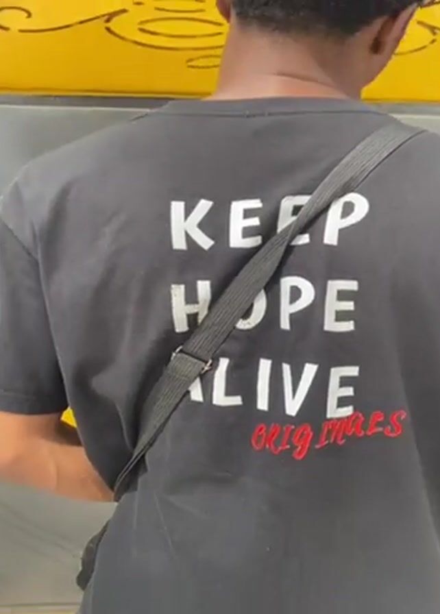 A young man wearing a black t-shirt with the phrase "KEEP HOPE ALIVE ORIGINALS" printed on the back, in white except for the word "ORIGINALS" in red, is shown from the back