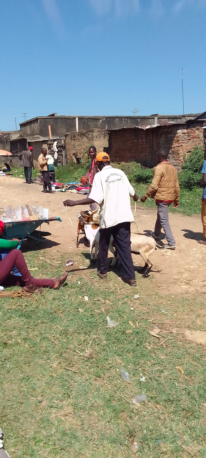 The image depicts a scene in Kakunga, Kenya, at coordinates 0.374 latitude and 34.855 longitude. There are multiple people in the scene, some interacting with each other. A man wearing a white shirt with the words "Southern Welding Ltd." and a phone number on it is holding a rope attached to two goats. The goats are standing near the edge of a dirt path. One goat has a brown coat, and the other is white. The man is walking towards the right side of the image. There is a man wearing a brown jacket and a man wearing a red shirt, and they are standing on the left side of the image. All the people are standing on a dirt path, surrounded by buildings and grass. There are a few items on the ground near the goats and other objects scattered on the path and grass. The sky is a clear blue with a few small white clouds visible. A handcart is on the left side of the path. The handcart is filled with empty, clear plastic containers. There are power lines running across the background of the image.