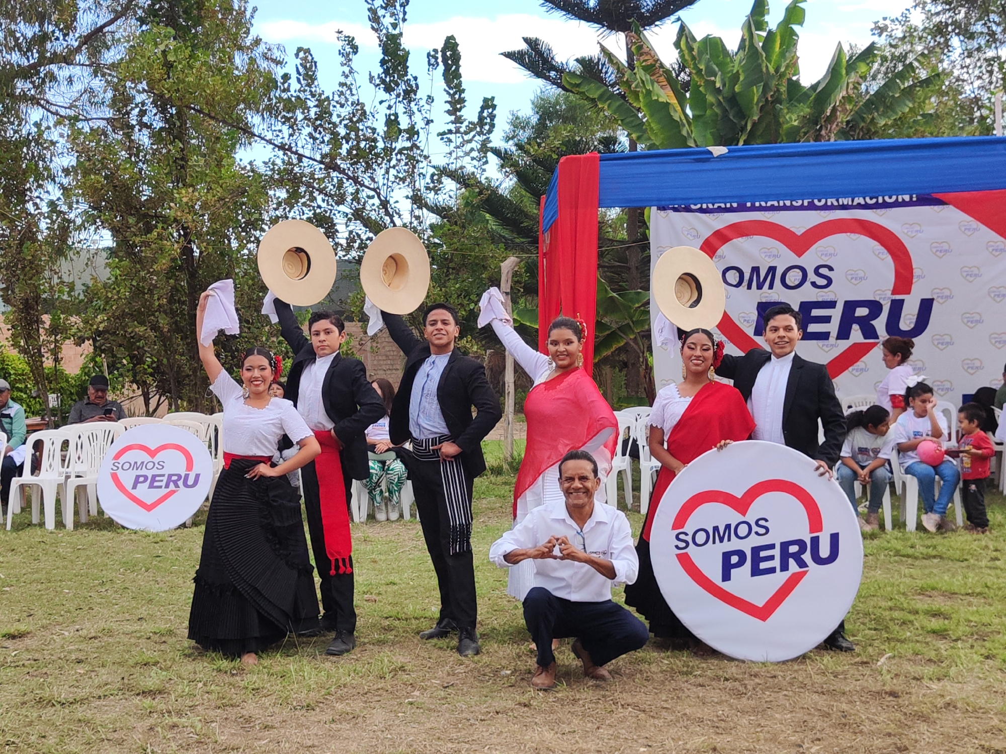 group of seven people posing outdoors in a grassy area, likely for a photograph, possibly in Coronel Gregorio Albarracín Lanchipa, Peru. Six of the people appear to be dressed in traditional Peruvian attire, including white shirts, black jackets, colorful sashes, and long skirts for the women. Three of them hold up straw hats. The seventh person, a man, is crouching in front of the group and making a heart shape with his hands. Behind the group are two large circular signs that read "SOMOS PERU" ("We are Peru") with a red heart symbol. In the background, there are people sitting in white chairs, a decorated banner, trees, and other vegetation. The overall setting is outdoors, potentially at a public event or gathering.
