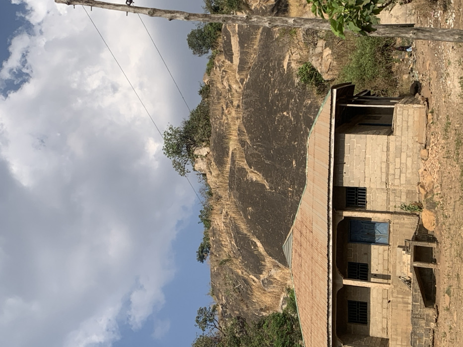 The scene is set in Okengwe, Nigeria, depicting a residential structure positioned against a large, dark-colored rocky hill under a partly cloudy sky