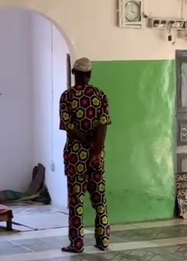 A man in a geometrically patterned matching outfit stands in a room with white and green walls and a tiled floor. He has his back to the camera. He is wearing a white hat. There is a clock on the wall. An old ceiling fan is visible overhead. A doorway is visible on the left. The man remains stationary as a religious call is heard. There is a sign on the wall to the right with Arabic script.