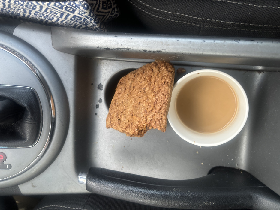 The image displays the interior of a vehicle, specifically the center console area, located in Nes Ziona, Israel. A gray plastic console features a black gear shifter with a chrome trim and a "P" (Park) indicator, positioned at the top of the frame. Below the gear shifter, a black handbrake lever with a silver release button is visible on the left. The console contains two recessed cup holders. In the right cup holder, a white paper cup holds a light brown liquid, consistent with coffee or tea with milk. Resting across the cup holder and extending onto the console surface is a large, irregularly shaped, brown baked good with a textured, crumbly appearance; a section is visibly broken off from its left side. To the right of the console, a portion of a seat or bag covered in a blue and white patterned fabric is visible. The console surface appears slightly worn and shows minor dust or debris.
