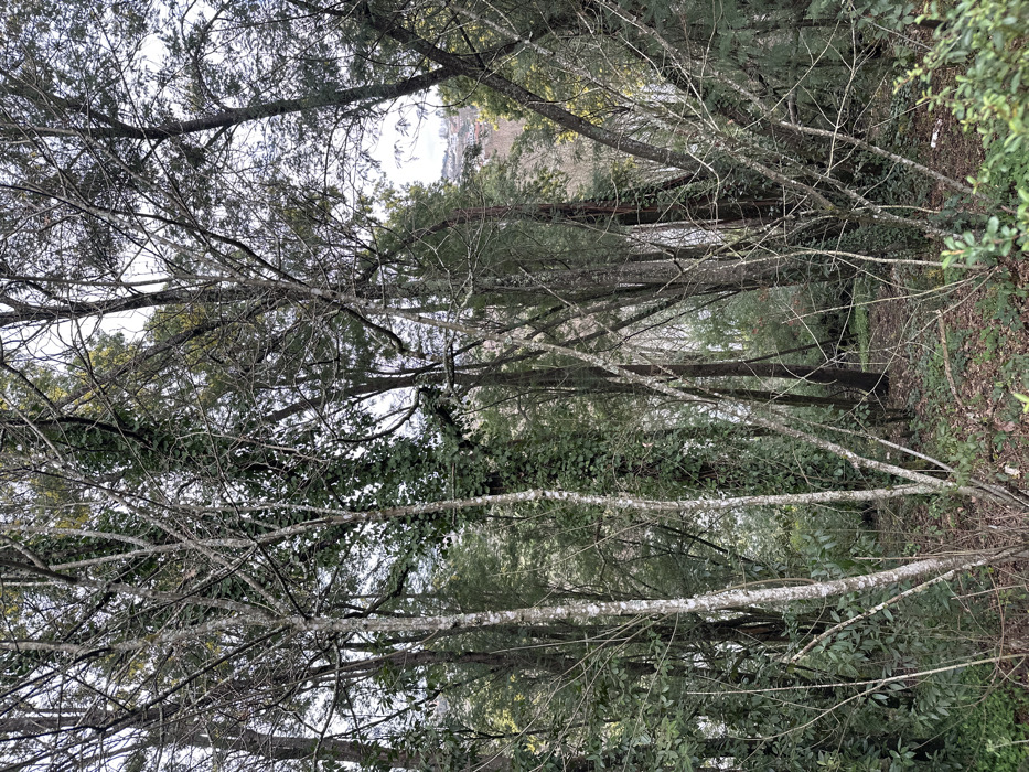 A narrow path winds through a dense forest. Leafless, light-colored tree trunks stand vertically, their bare branches intertwining overhead. Patches of green foliage cling to some trunks, contrasting with the bare branches. The path is barely visible, obscured by the dense vegetation on either side. A distant glimpse of pale sky suggests a break in the trees at the end of the path. The image conveys a sense of enclosure and the raw, untamed nature of the forest.