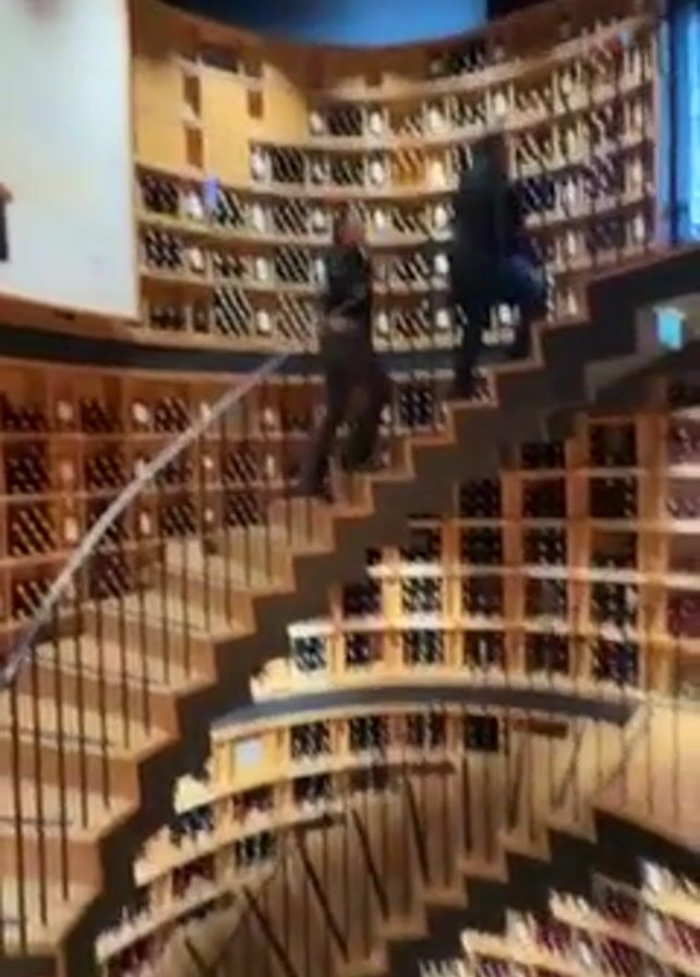 The video depicts the interior of a wine cellar with a distinctive circular staircase. The staircase winds around a central open space, with each level of the cellar lined with wooden shelves filled with wine bottles. Two people are shown walking up the stairs, and the camera pans downwards to provide a view of the entire structure from above, showcasing the spiraling design. The scene is well-lit, highlighting the extensive collection of wines and the architectural design of the cellar.
