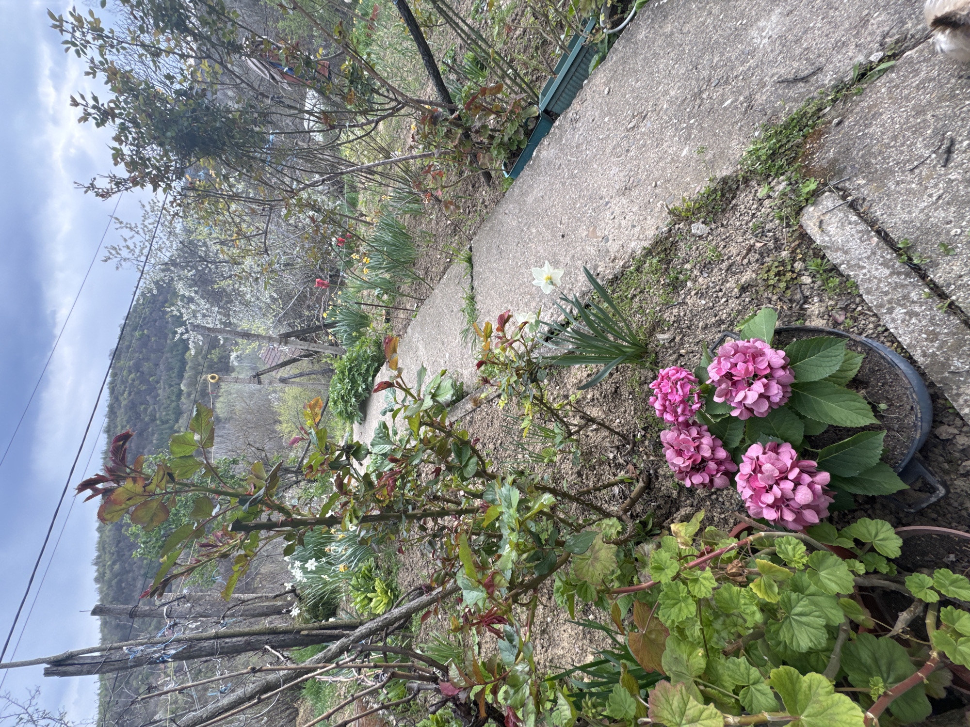 garden in Sinagovtsi, Bulgaria. A concrete pathway cuts through the scene. To the right of the pathway are pink hydrangeas in a pot. Other plants, including daffodils and a rose bush, are present. A hillside with buildings is visible in the background. There are power lines running parallel to the horizon on the left of the image.
