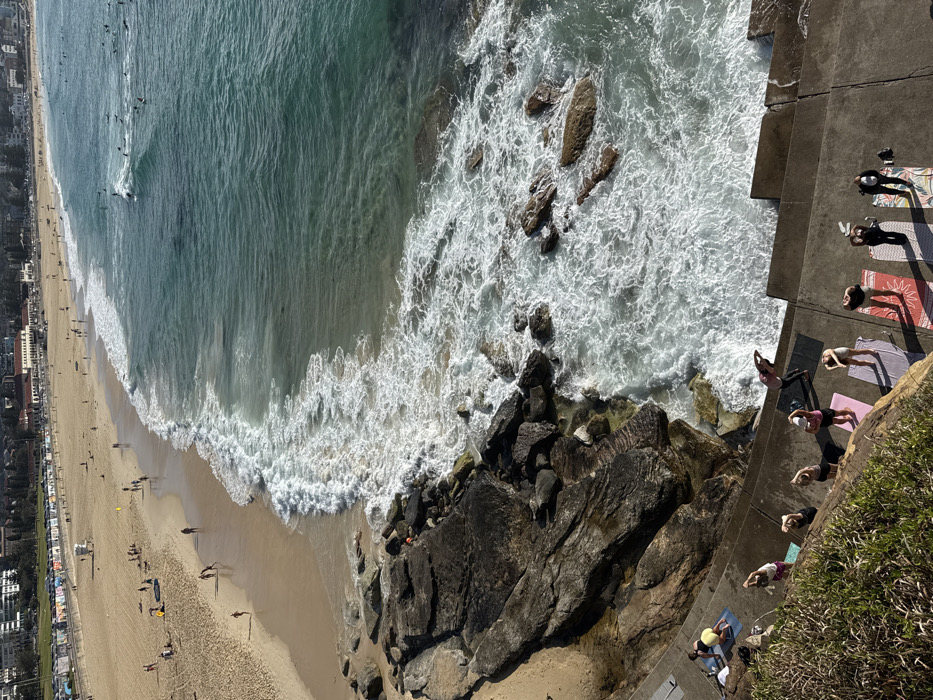 An aerial view shows a beach scene. People populate the sandy shoreline near a building. The sea's edge is marked by crashing waves next to dark rocks. Further out, the water turns a deeper blue. On a concrete area adjacent to the rocky coastline, a group is practicing yoga on mats. Greenery grows along the edge of the concrete platform.