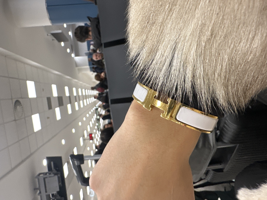 The image depicts a close-up view of a person's left forearm adorned with a gold-toned cuff bracelet featuring white enamel inserts, prominently displaying an 'H' motif