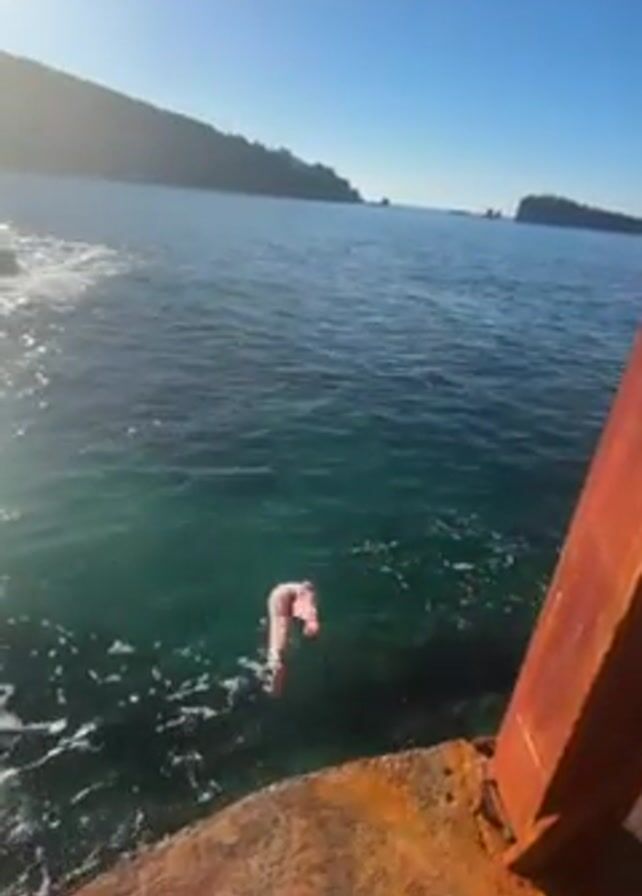 A person in a light-colored swimsuit jumps off a rocky ledge into the ocean. The water is clear and blue, and there is a small island in the distance. The sky is clear and blue with a light sun flare. There is a red-painted wooden structure on the right side of the frame. The person's entry into the water creates a splash and bubbles.