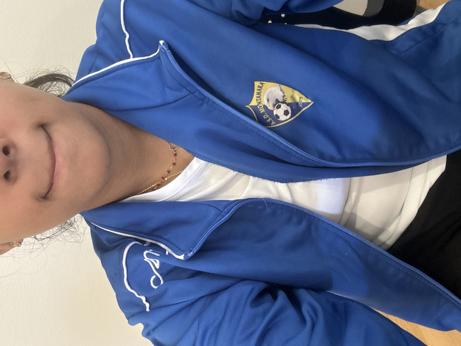 The image displays a close-up, chest-level view of an individual, likely female, with medium skin tone. The subject is wearing a partially unzipped blue track jacket featuring white piping along the seams. On the wearer's left shoulder, a white embroidered logo, appearing to be a stylized athletic brand mark, is visible. On the wearer's right chest, a shield-shaped patch is affixed, featuring "A.S.D. MONTANARA" at the top, a soccer ball, an eagle, and the year "2009" on a blue and yellow background. Beneath the jacket, a plain white t-shirt is visible, along with a delicate gold-toned necklace adorned with small red beads. The lower portion of a dark-colored garment is also observable beneath the white t-shirt. The subject's lower face is visible, showing the nose, a closed-mouth smile, and the chin. Small, round, light-colored earrings are present in the earlobes. The background is a plain, light-colored wall, indicating an indoor setting. The image provides no specific visual cues to determine the location within Puebla City, Mexico.