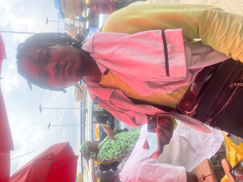 The image depicts a crowded street market scene in Ebute-Metta, Nigeria, under a bright, overcast sky. The primary subject is a young male, positioned centrally and looking directly forward. He has dark dreadlocks, a light complexion, and a serious expression. He wears a yellow long-sleeved shirt, over which a light pink or faded white shirt is draped across his shoulders. A black satchel with a zipper is slung across his body. His left hand holds a red smartphone horizontally, its screen reflecting light. To the left of the main subject, partially obscured by a red market umbrella or canopy, a woman in a green and white patterned dress and headwrap stands, looking down at her own phone. Another person in a white garment is partially visible next to her. In the background, multiple vehicles are visible, including a white SUV or van. Tall light poles with solar panels are prominent against the sky. Further back and to the right, other individuals are visible, including one carrying a large woven basket on their head, indicating market activity. On a stall in the lower left, dark, oblong items, possibly dates or other produce, are visible. The overall environment suggests a bustling urban market.