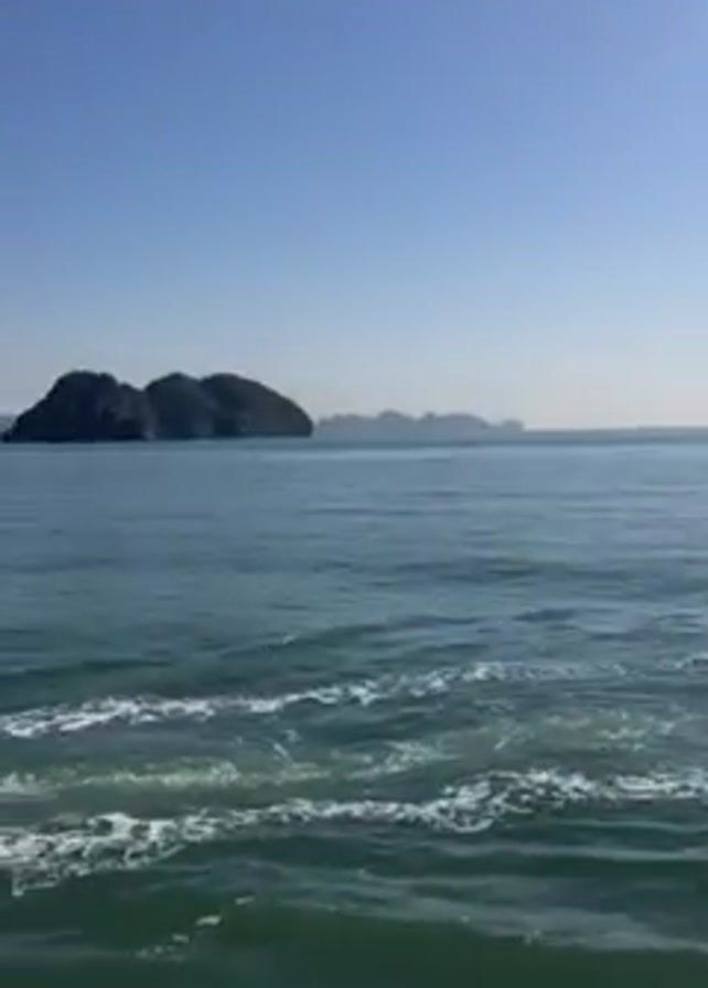 boat traveling on the ocean with a view of islands in the background. The water is green and the sky is blue. The boat appears to be carrying cargo and has a green roof. A flag of Vietnam is flying on the boat.