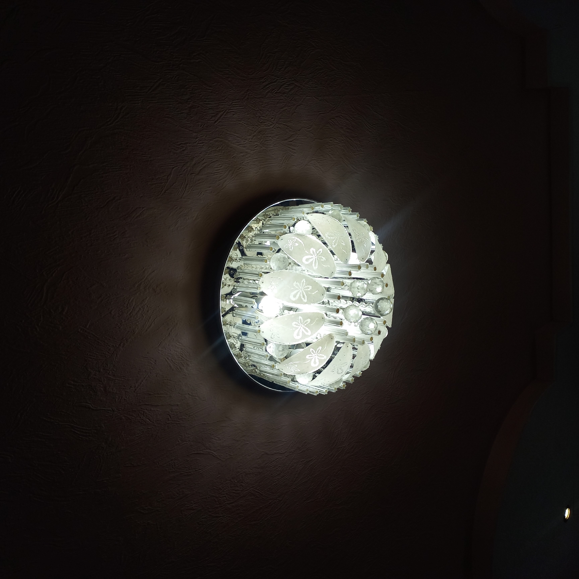 A circular, multi-element ceiling light fixture, resembling a chandelier, is centrally mounted against a dark, textured ceiling. The fixture features a silver-toned base from which numerous clear cylindrical glass rods, spherical faceted glass elements, and frosted, leaf-shaped glass panels with etched floral or bow patterns descend. It is illuminated, emitting bright white light that causes visible lens flares and highlights the decorative elements. The surrounding ceiling is a dark brown or dark beige color with an uneven, relief-patterned surface. The overall environment appears dimly lit, with the light fixture serving as the primary illumination source. No individuals or other discernible objects are present within the frame. The location is the city of Kurganinsk, Russia.