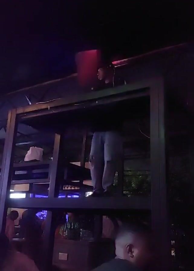 At night, a person stands in a metal structure that appears to be part of an outdoor bar or entertainment venue. They are wearing jeans with a tear at the knee, a dark shirt, and shoes. They are positioned on the upper level of the structure, which is open to the surrounding environment. The structure features shelves or platforms that hold bottles and other items associated with a bar setting. Below, other individuals are visible, suggesting that the venue is populated. The scene is dimly lit with colored lighting, indicative of a nighttime entertainment setting. The camera is positioned to look up at the person on the structure.