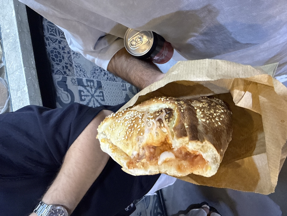 The image displays a close-up, eye-level view of two individuals in an indoor setting, focusing on a partially consumed food item. A large baguette, approximately 25-30 cm long, is held upright within a plain brown paper bag. The bread is crusty, dark brown, and heavily coated with sesame seeds. The visible interior filling consists of a reddish sauce, melted white cheese, and several distinct white, curled pieces, consistent with cooked shrimp or similar protein. One individual, wearing a light-colored, short-sleeved shirt, holds the paper bag containing the baguette with their right hand. Their left hand, partially obscured, holds a red and black aluminum beverage can with a silver top. This individual's hairy forearms are visible. To the left, the left arm of a second individual is partially visible, wearing a dark-colored, short-sleeved shirt. A silver-toned wristwatch with a dark face is present on their wrist. This forearm is also visible and appears hairy. The background features a tiled wall or counter base with a repeating pattern of blue, grey, and white geometric and floral motifs. Above the tiled section, a light-colored countertop is partially visible. The specific location within Rishon LeZion, Israel, is not discernible from the provided image.