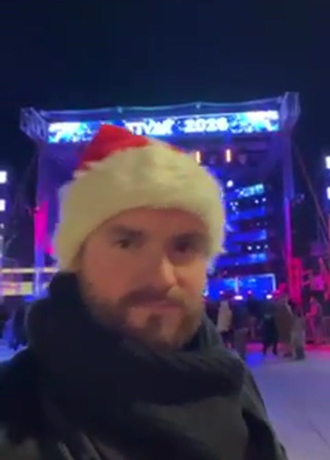 man in a Santa hat, a black coat, and a black scarf standing in what appears to be an outdoor festival or event at night. Behind him is a large stage structure lit with blue and purple lights, with the words "Tivat 2023" visible on the top. There are people walking around in the background. The camera angle is mostly stationary, held by the person, with a slight pan to the right at one point. The overall atmosphere seems festive.