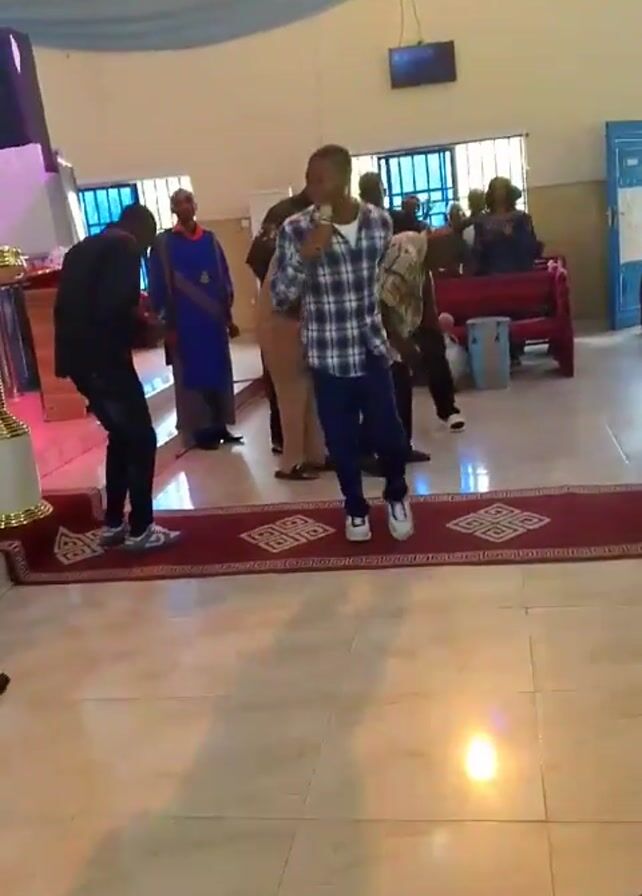 In a room that appears to be a church or community center, several people are dancing on a tile floor in front of a red rug. There are windows in the background. Some of the dancers are dressed in casual clothes while others wear more formal attire. There is a small screen mounted on the wall, and a lighting fixture hangs from the ceiling. A woman is seated on a bench near the back of the room. A decorative gold object stands to the left of the dancers. The overall atmosphere suggests a lively celebration or event.