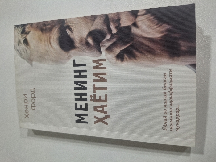 A single book with a white cover featuring vertical subtle stripe patterns is depicted, resting on a flat, light-colored surface. The cover displays text in black and brown Cyrillic script. At the top, "Хенри Форд" (Henry Ford) is printed in black. Below this, the title "МЕНИНГ ҲАЁТИМ" (My Life) appears in a larger, bold font, with "МЕНИНГ" in black and "ҲАЁТИМ" in brown. The right half of the cover features a grayscale portrait of an older man, identified as Henry Ford, looking towards the left side of the frame, with his right hand visible at the bottom right. At the bottom left of the cover, a quote in smaller brown Cyrillic script reads, "Ўйлай ва ишлай билган одамнинг муваффақияти муқаррар..." (The success of a person who knows how to think and work is inevitable...). The book casts a faint shadow on the surface to its right and bottom, indicating a light source from the upper left. The image does not contain information to identify a specific geographical location, including the city of Urgench, Uzbekistan.