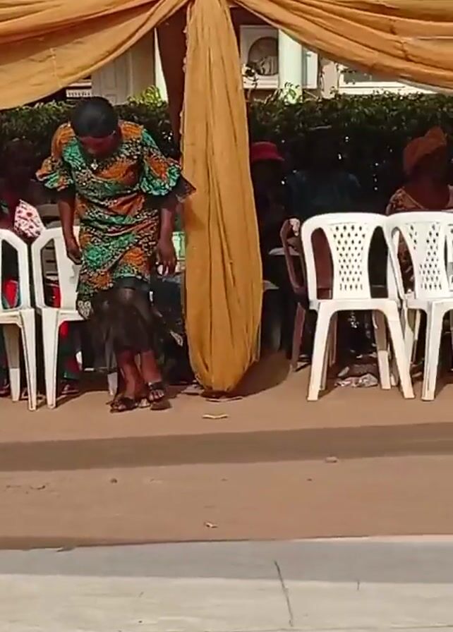 group of people seated under a canopy. They are sitting on white plastic chairs. The canopy is made of light-colored fabric that is draped overhead. There are several people of different ages, including a child wearing a yellow shirt. Some people are wearing traditional African clothing. The setting appears to be an outdoor event or gathering. A woman in colorful clothing adjusts a chair. The ground is a mix of white concrete and reddish-brown earth.