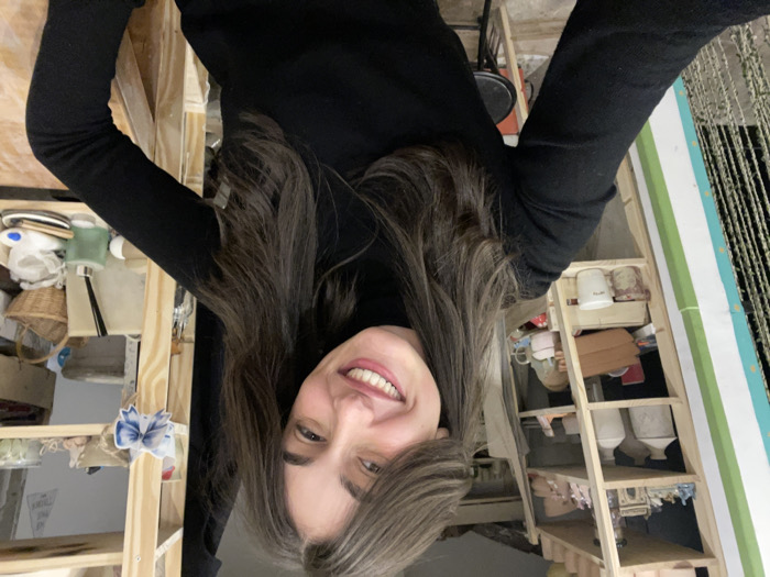 A woman with long, graying hair smiles directly at the camera, wearing a black turtleneck sweater. The shot is taken from an unconventional angle. In the background, wooden shelves hold various items, including mugs and decorative objects. A bead curtain hangs on the right side, adding texture to the scene. The setting appears to be a cluttered studio or workshop, giving the image a candid and personal feel.