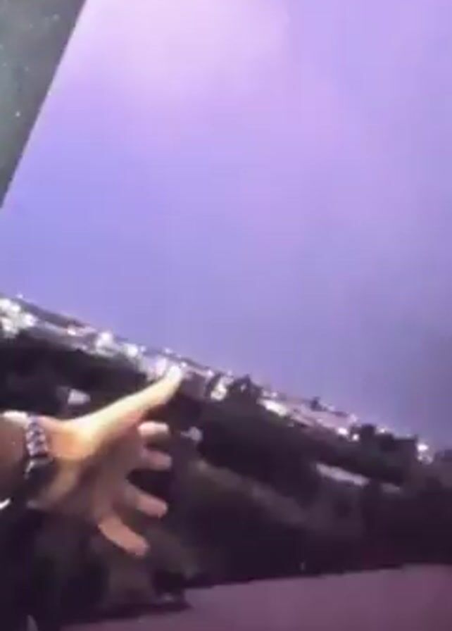 From a dark vantage point, a hand with a wristwatch briefly reaches out over a cityscape at night. Bright lights dot the horizon, and a sudden burst of light illuminates the scene before disappearing. The view returns to darkness.