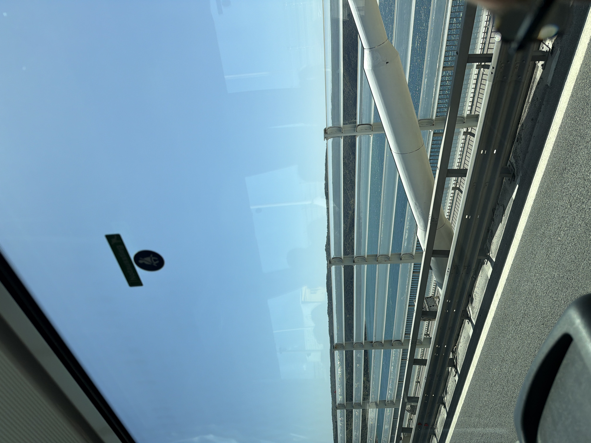 view from inside a vehicle, looking out over a highway in Sarıyer, Turkey. The camera is pointed upwards, revealing a clear blue sky with reflections. A small, rectangular sign with a circular symbol is attached to the window. The highway features a white support structure and transparent wind barriers. A grey guardrail runs along the edge of the road, which is made of grey asphalt.