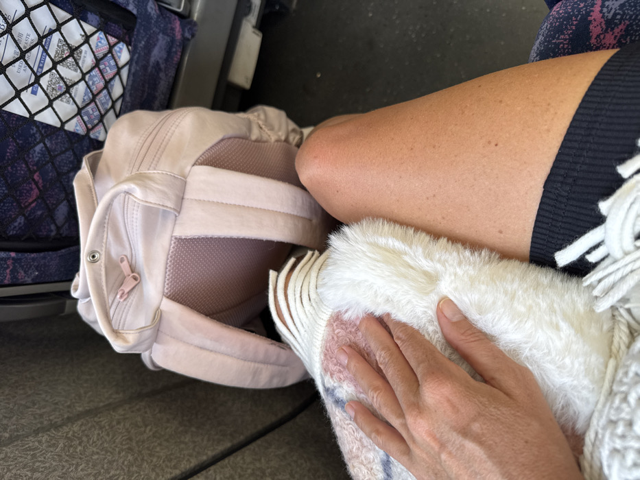 The scene depicts a personal perspective from a seated position inside a passenger compartment, likely a train, in Guilin, China. The foreground features a light-skinned hand, resting on a multi-textured blanket covering the subject's lap. The blanket exhibits a fluffy white section, a patterned area with pink and blue colors, and a white fringed edge. Below the blanket, the subject's bare, light-skinned upper right thigh and knee are visible, displaying freckles, above dark, ribbed shorts. In the background, a light pink backpack, featuring visible shoulder straps, mesh back padding, and a zippered front pocket with two pink zipper pulls, is positioned on a patterned seat. Behind the backpack and to the right, a blue and purple patterned seat is visible, equipped with a black mesh storage net. Inside this net, a white paper document is present, displaying Chinese characters, a QR code, and partial English text including "USED WATER PROOF." To the left, a textured, lighter-colored panel, possibly a wall or window blind, is visible.