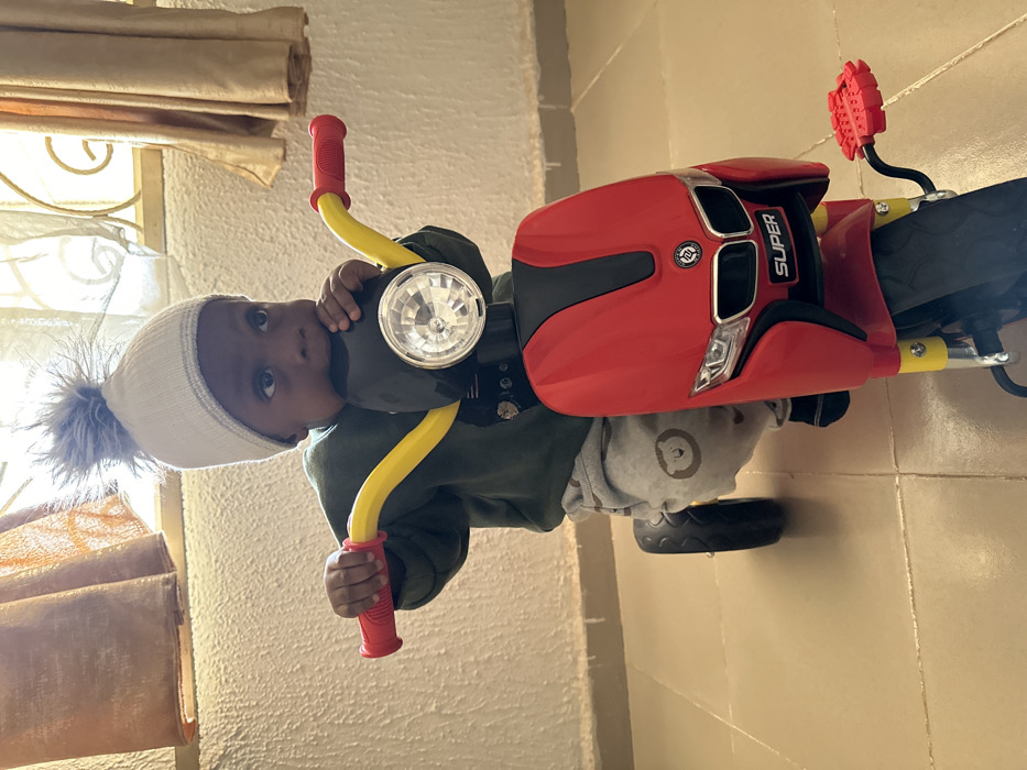 An indoor scene in Barikin Jirga Summa, Nigeria, depicts a young child seated on a red plastic ride-on toy resembling a scooter