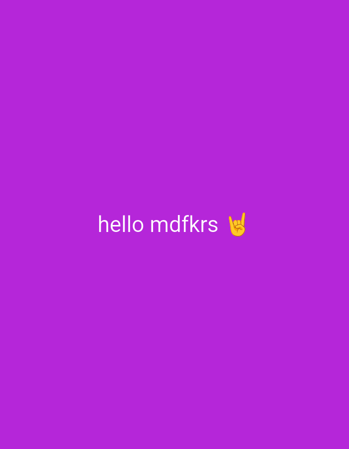 A digital image displays a solid, uniform purple background. White sans-serif text, reading "hello mdfkrs," is centrally positioned, slightly above the vertical midpoint of the frame. Immediately to the right of the text, a yellow-skinned hand emoji executes the "rock on" gesture, with the index and pinky fingers extended and the thumb, middle, and ring fingers curled. No individuals, physical objects, or environmental features are depicted. The image does not contain any visual representation of the city of Zhiten, Bulgaria, or any physical location.